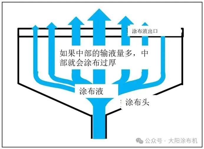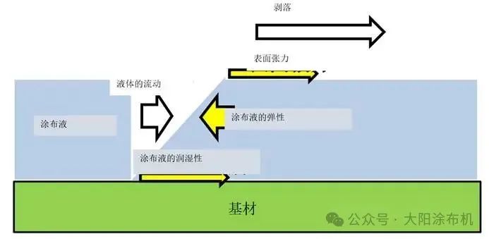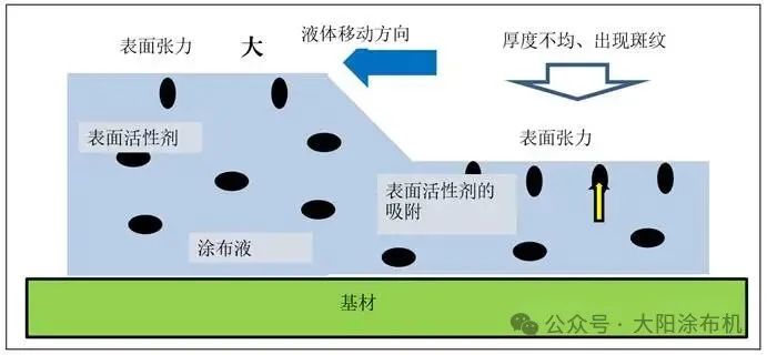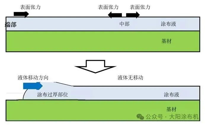 涂布面中心部位因表面張力作用導致涂布液向左右兩側(cè)擴散,而端部涂布液受表面張力單向牽引(僅向右),引發(fā)液體向右側(cè)遷移并形成局部增厚區(qū)域。